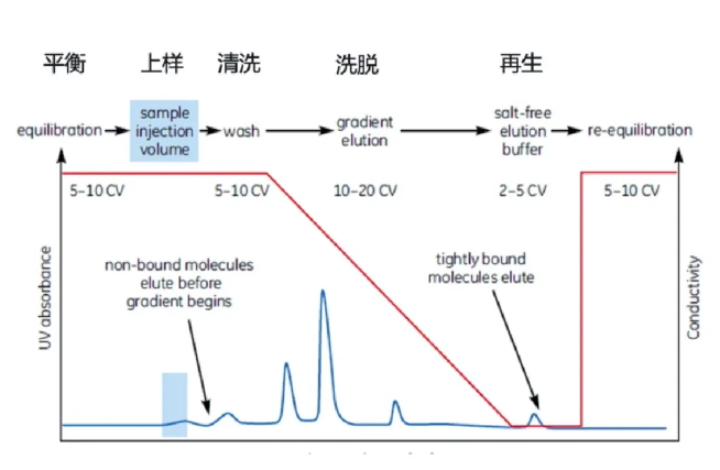 離子交換層析是基于蛋白質(zhì)和離子交換層析介質(zhì)之間的電荷相互作用進(jìn)行分離。離子交換層析介質(zhì)通常帶有正或負(fù)電荷,吸附帶有相反電荷的蛋白質(zhì)。通過調(diào)整緩沖液的離子濃度或pH值,可以改變蛋白質(zhì)與介質(zhì)的結(jié)合強(qiáng)度,實(shí)現(xiàn)不同蛋白質(zhì)的分離。